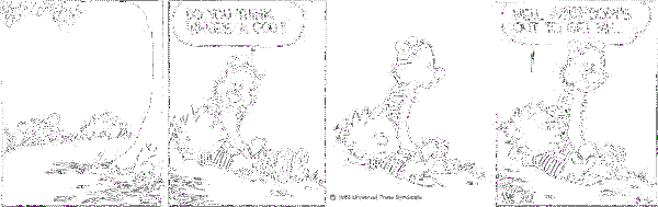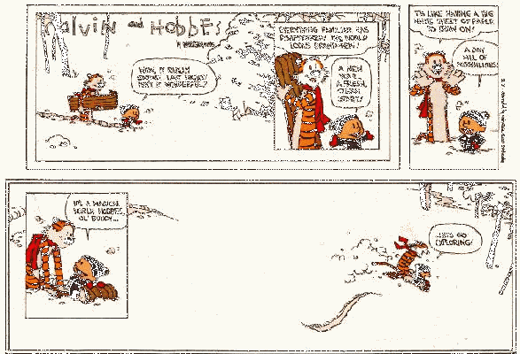NOTE: Calvin and Hobbes comic strips are the copywrited material of its creator Sam Waterson and/or Universal Press Syndicate. I did not get permission to put these images on my webpage, but hopefully anyone who is associated with the strip will look upon their appearance here as a memorial to Mr. Waterson's great work.